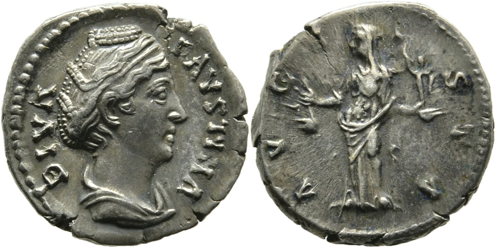 Der Avers dieses Denars zeigt die drapierte Büste der Faustina der Älteren mit Hochsteckfrisur nach rechts. Die Legende DIVA FAVSTINA nennt ihren Namen und Status: Nach ihrem Tod um 140 n. Chr. wurde sie von ihrem Gatten Antoninus Pius vergöttlicht und erhielt den Zusatz „diva“ (lat. göttlich/vergöttlicht). Dieser Denar wurde dementsprechend vom Kaiser im Gedenken an die verstorbene und zu den Göttern erhobene Faustina der Älteren ausgegeben.